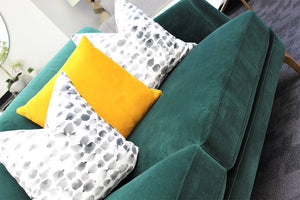Inspired by the roaring twenties, the Gustav sofa's symmetrical lines and unique shaped edges offer a modern take on art deco styling. In plush forest green velvet and filled with sumptuous foam, the Gustav is as soft and comforting as it is beautiful.