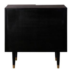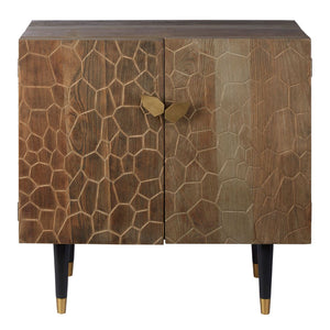 The Malay sideboard is expertly handcrafted from recycled elm wood and features a carved effect of abstract geometric patterns on the doors. Black finish wooden legs contrast the natural accent of the understated top.