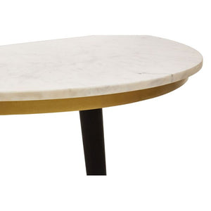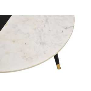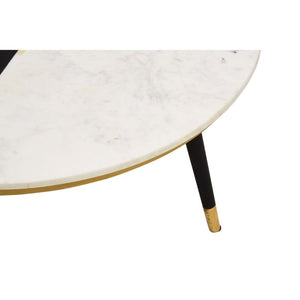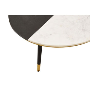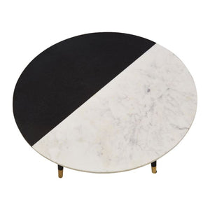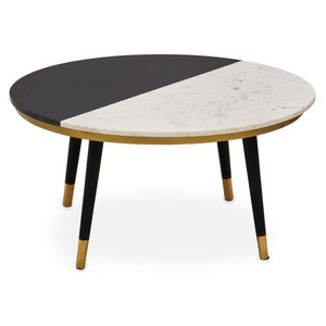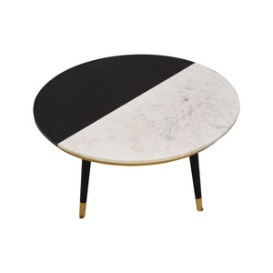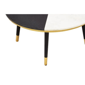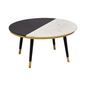The Nirav coffee table has a split colour table top of white and black marble, with black wooden legs and gold tips.
