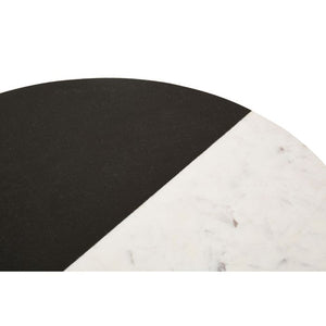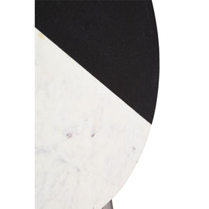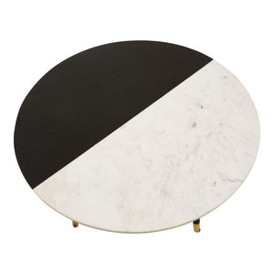 The Nirav coffee table is modern and edgy. The table is half white marble and half black marble, perching on black wood legs which has gold tips.