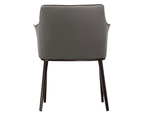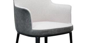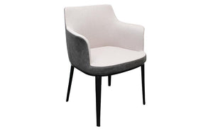 - Details: Chair upholstered in grey PU leather and cream fabric, fitted with dark legs.