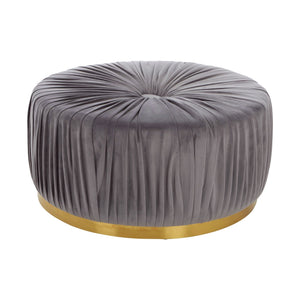 This stool features distinctive grey fabric upholstery with a pleated design which adorns its rounded top and sides. Each layer of the vibrant fabric is inverted to form a symmetrical, layered pattern. This ottoman will incorporate a sense of plush design and texture to make a decent statement in a luxe setting.
