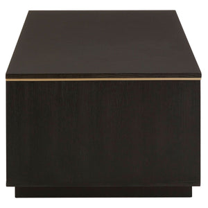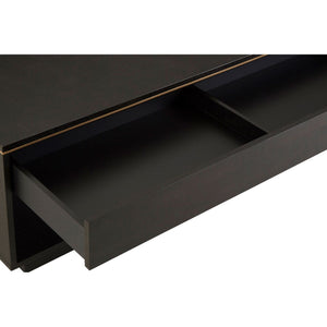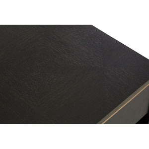 The top of the Diamond coffee table is made from oak veneer and has a subtle etch pattern. The sustainable rubberood is left smooth and has a black colour that matches the oak. A wide drawer with two compartments provides storage, and gold finish trim adds warmth to the look.