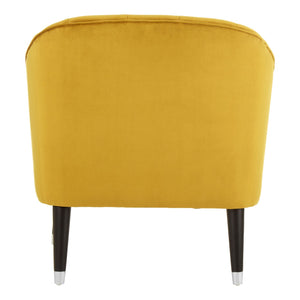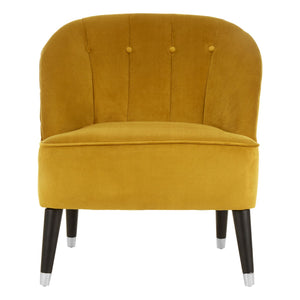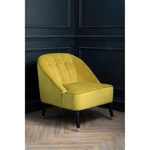 Upholstered in tactile velvet, the Doucet chair is comfortable as well as stylish. Modern channel tufting adds depth and decoration to the backrest, with four small buttons and piped hem details enhancing the design. Four black rubberwood legs sit at an angle, raising the contemporary chair from the ground. Chrome finished metal caps the legs, adding textural and tonal contrast to the soft dijon velvet.
