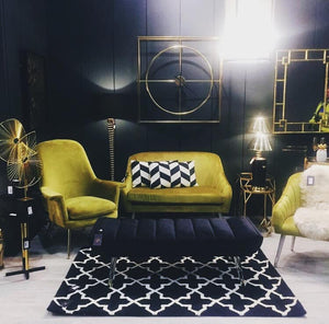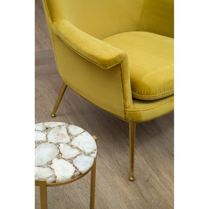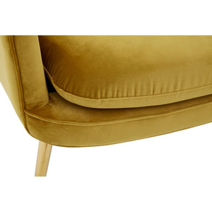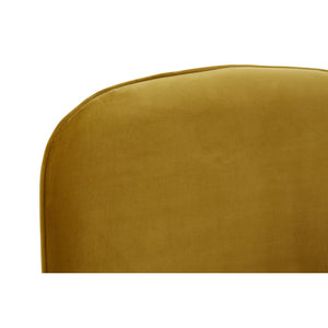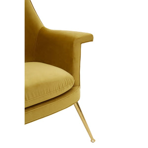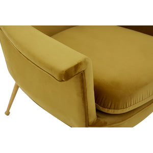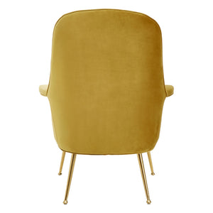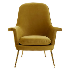 The Harli chair features sweeping design lines and a modest silhouette. It boasts soft chenille upholstery, coloured a bold pistachio to complement the gold finish stainless steel legs.