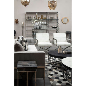 The chair is upholstered with genuine leather covered with white hairs for a textured finish. Subtle stitching creates four square panels on the thick padded seat and backrest. The backrest has a reclined design giving the chair a relaxed aesthetic. It's cradled in a minimal frame made from polished stainless steel.