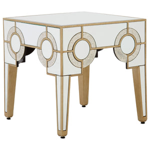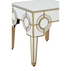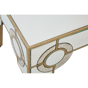 Each corner of the Knightsbridge coffee table is decorated by a segmented circle motif made using antique-finished mirrored glass.