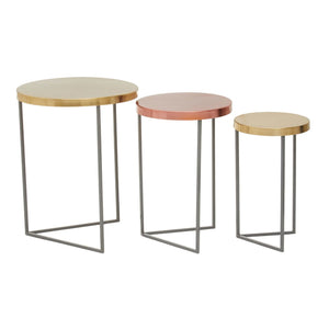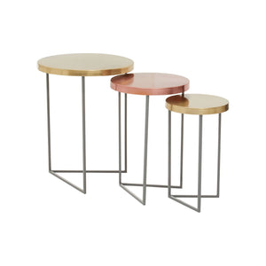 Each of the three Korba tables boasts a warm metallic round top and a slim grey finish metal base creating an angular profile. The size of these tables varies and effortlessly nestle together to make room in crowded places.