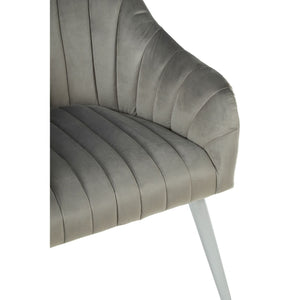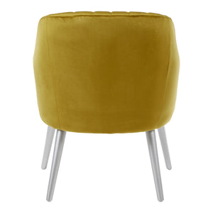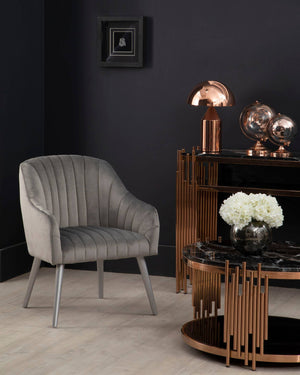 Upholstered in bold mustard,grey fabric, the Louxor armchair is soft and luxurious to the touch. Its sloping armrests are accentuated by the chairs contemporary channel tuft detailing. Four cylindrical wooden legs are angled and feature a cool silver finish, counterpointing with the warm toned upholstery.