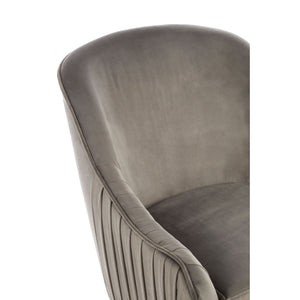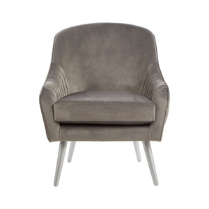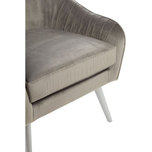 With silver coloured wooden legs, complemented by velvet fabric upholstery, the Louxor chair is suitable for a contemporary luxe design setting. A distinctive feature of this chair is the curved and pleated armrests which contrast with the smooth backrest. Its legs have a tapered design that follows the lines of the armrests.