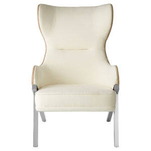 Designed in a contemporary wing-back style, the Piermount chair is upholstered in soft white fabric. The chair's distinctive back is upholstered in a light beige tone with subtle quilting that creates a textured look. The chair's distinctive angular legs are crafted from smooth stainless steel and feature a sleek silver finish.