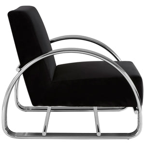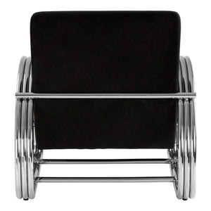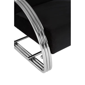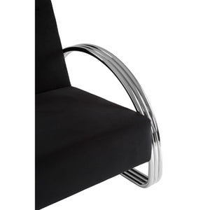 Made from black fabric upholstery, foam and stainless steel frame with sleek silver finish.