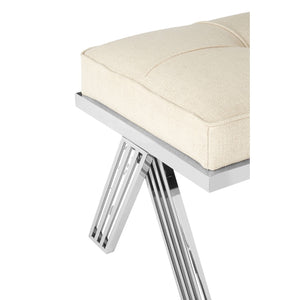 Upholstered in light grey fabric, this stool has a thick padded rectangular seat adorned with piped trim. The stainless steel base with linear detail offers a reflective counterpoint to the fabric. It adds a luxe accent to interiors.