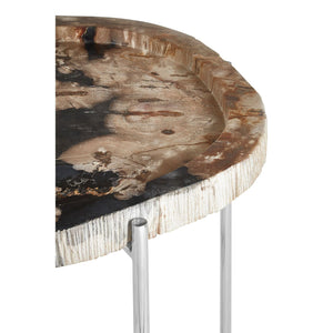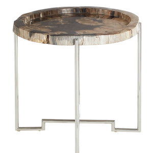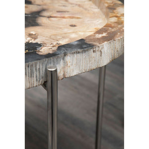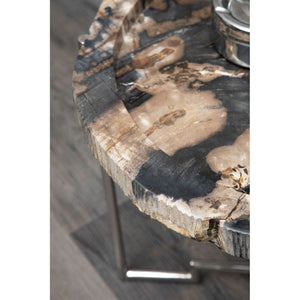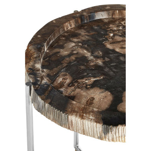 The Relic side table's angular, geometric frame is made from durable stainless steel, boasting a cool reflective finish. A round section of petrified wood with a raised rim counterpoints the metallic frame. The fossilized wood top boasts prominent dark and light graining creating distinctive patterns and lending texture to the surface.