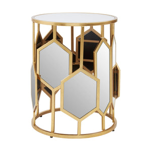 The Rio side table features a gold finish iron frame which articulates luxurious appeal. The round mirrored glass top complements the multisized hexagon mirrors that are neatly set on the sides of metallic base. Ideal for styling in a warm metallic interior, this side table will make a distinctive addition to the living room.