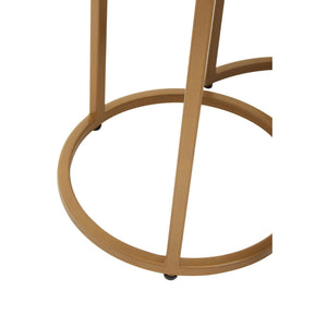 This table set features black marble tops in a round shape boasting subtle veining and swirls on the smooth surface. The matte gold base of these nesting tables is made from robust iron, while the crescent design at the bottom ensures swift nesting.