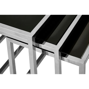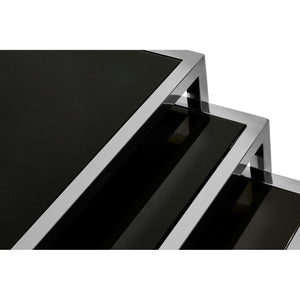 Each table has a frame made from sleek stainless steel, with a chrome coating for a reflective finish. Their tops are made from tough tempered glass and have a black finish that combines with the steel to create a monochromatic effect. The nesting design makes them ideal for buyers looking to create additional surface space in smaller interior settings.