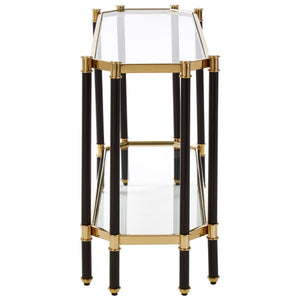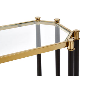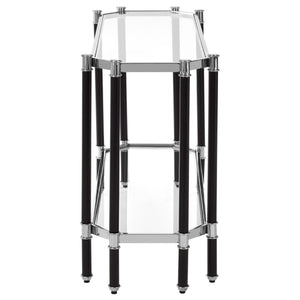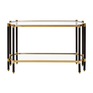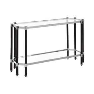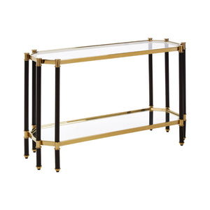 The Allessi console table boasts two tiers of clear tempered glass held in place by a sleek stainless steel frame. Three legs at each side are finished in black and feature gold finish and silver finish accents for a reflective contrast.
