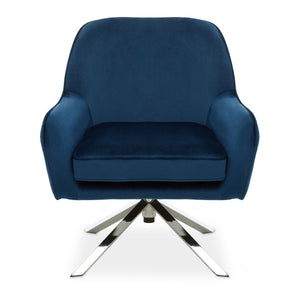 The Avery chair features a curved backseat and flared armrests with a foam padded seat upholstered in sumptuous midnight velvet. The luxurious seat is supported by a chrome finish cross-base which adds style with support.