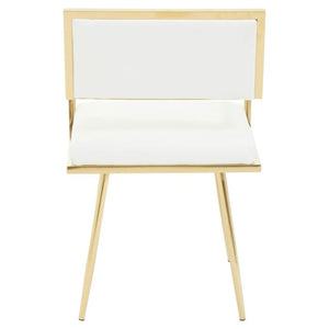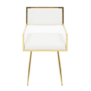 The Azalea dining chair blends easily in both modern and classical spaces because of its sleek aesthetics. Featuring a cut-out back conjoined with armrests, the ivory leather effect seat and gold finish slanted legs ensure a cosy seating experience.