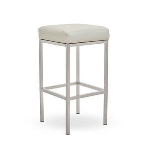 This bar stool features a square padded seat upholstered in dark grey, black, white faux leather. Simple and elegant chrome finish legs and footrest elevate luxe aesthetic of the modern design.