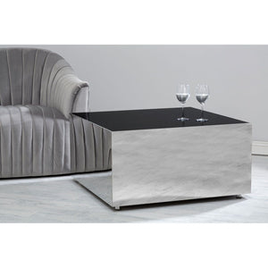 This reflective, chrome-finished, square coffee table, topped with black tempered glass is a statement piece ideal for a glamorous home interior.