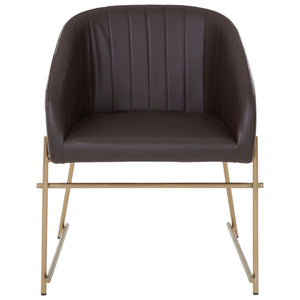 The seat is upholstered with soft faux leather, and its lines are inspired by classic tub chair design. Its legs are made from smooth stainless steel and are finished in brass to complement the brown.