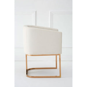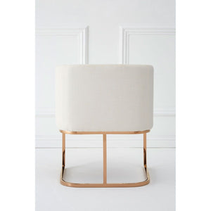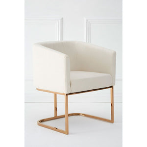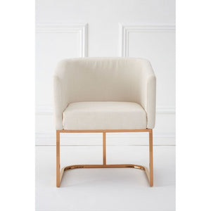 This contemporary dining chair is upholstered in soft linen fabric. The seat's slimline curved design aligns with the stainless steel legs. Their reflective rose gold finish complements the subdued ivory fabric, combining to make this an understated piece that complements luxurious boutique hotel design settings.