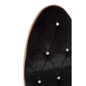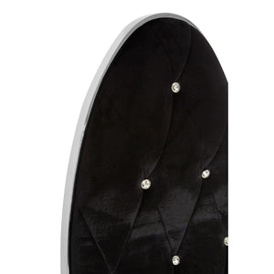 Upholstered in plush black velvet, this chair’s oval back is tufted with diamond pattern button detail. The curvaceous design and mirrored silver polish of the frame further its stylish, opulent aesthetic.