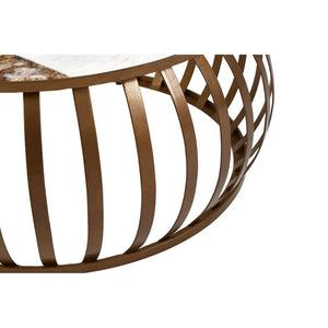 The round, white marble top is patterned by darker veins and wisps, creating a muted contrast to the colourful agate. The top is set into a base made from smooth iron, comprised of slats that swell outwards before curving in at the base. The iron has a brass finish, adding a rich metallic tone to this luxe accent piece.