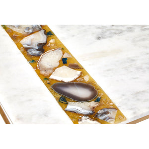 Its legs have a prismatic openwork design, are made from tough iron, and boast a warm, rich brass finish. The top is formed from a piece of square marble, coloured white and patterned by darker swirls and veins. Colour is introduced by way of a strip of semi-precious agate stone, set into one side of the tabletop.