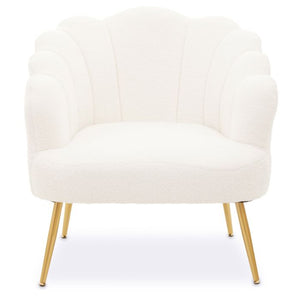 Upholstered in white teddy fabric, this modern accent chair features a decorative seashell back. The soft and plush seat in dense foam padding offers comfortable seating while gold finish legs bring stability.