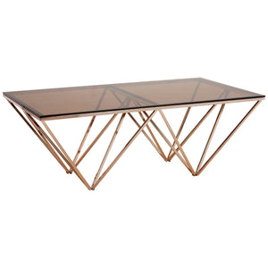 This sleek rectangular coffee table imparts boutique hotel luxury. The tabletop is made from safe tempered glass, its red-tinted translucency enabling an uninterrupted view of the distinctive legs beneath. Its linear metal legs are formed into a series of triangular shapes, with a champagne finish that gives them a warm look.