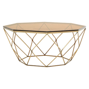 The Allure coffee table's base is formed from slim strips of metal which combine to create a geometric diamond pattern. Its brushed bronze finish accentuates the table's crystalline structure, allowing it to be styled easily with metallic accessories and lighting. The hexagonal tabletop is made from amber smoked glass, tempered for safety. Display it with boutique hotel style furniture.