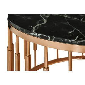 Its base is made from sleek iron and has a reflective rose gold finish. The undulating pipe detail adds a jazzy look to the aesthetic. Set into the top is a single piece of solid marble, with a black colour that it patterned by natural white veining. Coordinate this striking piece with warm metallic lighting and accessories.