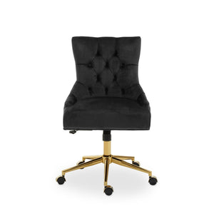 Upholstered with dense foam padding in black velvet, this office chair boasts a high backrest. Offering luxurious comfort with an adjustable height lever, this chair has a swivel base in the gold finish to create a luxe visual appeal in the living area.