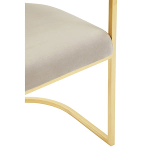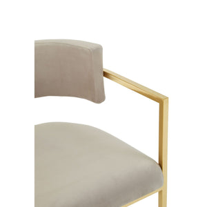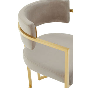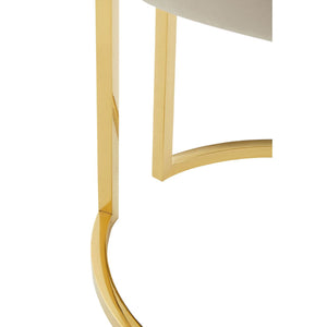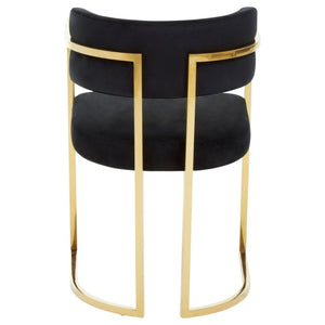 The Azalea bar stool features a plump seat upholstered in black velvet supported by a curving inner backrest for added comfort. The sturdy stainless steel frame in a gold finish lends an arching accent to the décor with its sleek profile.
