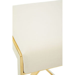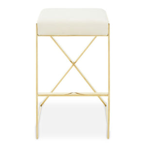 The Azalea bar stool features a plump seat upholstered in ivory and black velvet with a footrest for added stability and support. The sturdy X-shaped stainless steel frame in a gold finish lends a chic accent to the living area.