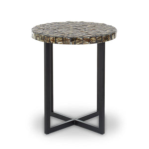 Formed from meticulously inlaid white shell detail, the top of this round side table will brighten up space with its charm and character. The decorative top in the smooth finish is supported with a clean, cross metal base.