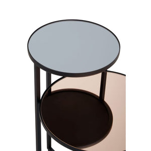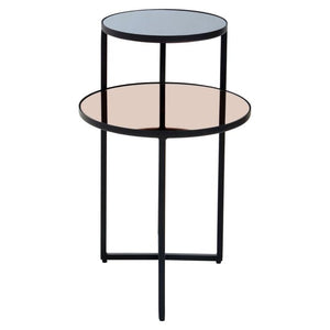 Featuring an elegant juxtaposition of style and form, this side table has circular smoked mirror tops positioned at different levels. The black finish frame extends to support the large and small tabletops through clean, asymmetric lines.