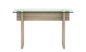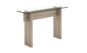 - Details - Console table with 10mm thick tempered glass top and stainless steel discs, base in engineered wood and grey oak finish.
