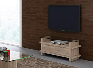 - Details: TV unit with 10mm thick tempered glass top with stainless steel discs, base in engineered wood and grey oak finish.