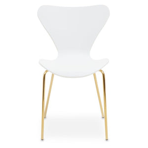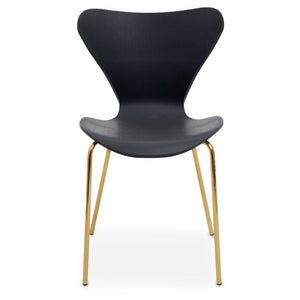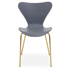 This chairs has a grey, black and white undulating seats that matches the tapered back. Gold finish angular legs offer a linear juxtaposition with the elegant curves of the design and enhance luxe appeal.