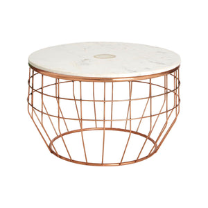 The Vizzini coffee table has a wireframe-style base formed from tough iron. Its copper finish offers a rich and reflective counterpoint to the milky white marble top. The luxurious marble is subtly patterned by darker veining, and features a single piece of semi-precious agate stone set into its centre.