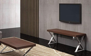 - Details: TV unit with walnut veneer 50 mm top, 8 mm toughened glass shelf and polished stainless steel base.