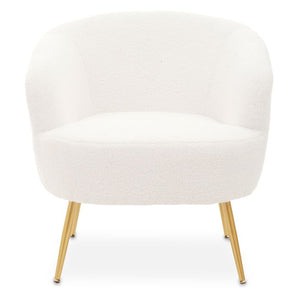 Upholstered in plush white teddy fabric, this modern accent chair features an elegantly curved back and fluffy arms. The seat in generous foam padding rests above angular legs in the metallic gold finish.