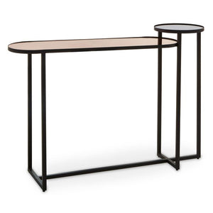 Featuring an elegant juxtaposition of style and form, this console table has circular smoked mirror tops positioned at different levels. The black finish frame extends to support the large and small tabletops through clean, asymmetric lines.